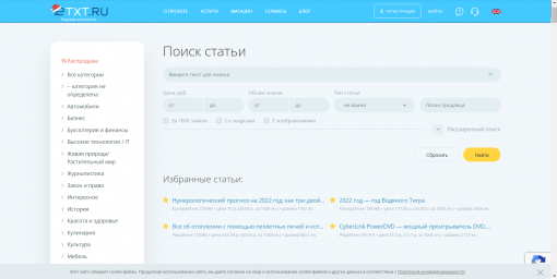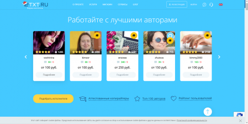 Etxt - это фриланс биржа, которая профилируется на продаже текстового материала. Заказчики имеют возможность приобрести текстовое наполнение своего сайта, а исполнители заработать на выполнении заказов. Здесь предоставляются все виды услуг по работе с текстом - seo-копирайтинг, переводы с одного языка на другой, создание художественных текстов и рекламных статей, корректура и редактура. Также есть возможность продать свою или приобрести уже готовую статью.